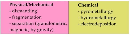 The first step in recycling electronic waste is its dismantling to remove minor and non-recyclable fractions (Figure 2). The next step is separating them into metallic and non-metallic fractions by means of magnetic, current-based, or density-based separation techniques. After that, metals from the processed e-waste are recovered using pyrometallurgical, electrodeposition, or hydrometallurgical methods [11,12,13,14,15].
