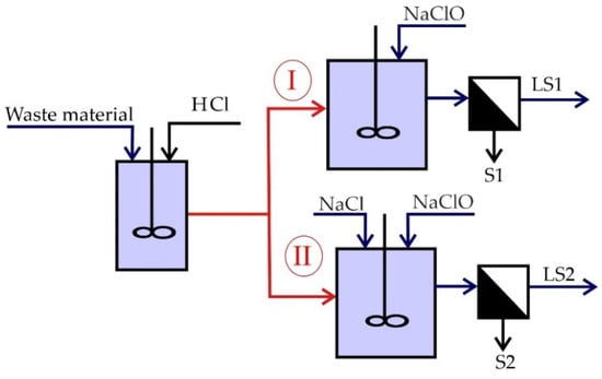 The chemical leaching tests of the waste samples were carried out on a lab scale in an open glass vessel system. Hydrochloric acid was used as a complexing agent and sodium hypochlorite with sodium chlorite as an oxidizing agent under different conditions. For all experiments, the L/S ratio was kept constant at 10/1.