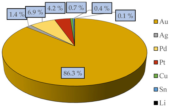 In cases where the construction and operation of pyrometallurgical plants are problematic for various reasons, such as high energy consumption, environmental concerns, and regulatory issues, hydrometallurgy becomes a good alternative. Hydrometallurgical technologies require low working temperatures, high efficiency, availability, and minimal gas emissions, in contrast to thermochemical processes [19,20]. Recently, the hydrometallurgical process for extracting precious metals has been used more often than the pyrometallurgical process. It is more accurate, predictable, and easy to control [21].