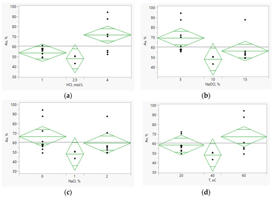 One-way ANOVA for gold dissolution depends on HCl (a), NaClO (b), NaCl (c), and temperature (d) values in the leaching process.