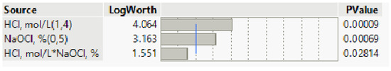 The effect summary table (Figure 7) allows us to evaluate the significance of the factors, showing them in ascending order of p-value. As can be seen, the response (Au extraction efficiency) is most influenced by hydrochloric acid. Instead, the interaction between HCl and NaOCl has a negligible impact on Au leaching.