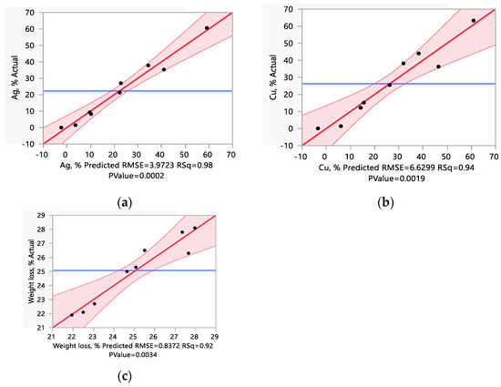 Actual response vs. predicted response plot for Ag (a), Cu (b), and weight loss (c), %.