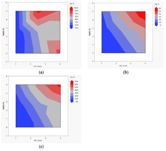 The contour plot of the extraction of Au (a), Ag (b), and Cu (c) as a function of HCl and NaClO concentration.