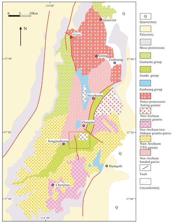 Geological sketch map of the Zanhuang Complex (Red box see Figure 2).