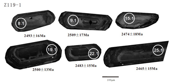 The zircon crystals selected for dating were obtained from rock sample Z119-1. These crystals exhibit euhedral to subhedral prismatic shapes, often displaying corroded pits on the surface, indicative of significant alteration during later geological events. The grain size of the zircon crystals mainly ranges from 100 to 300 μm, with a smaller proportion falling between 50 and 100 μm. The aspect ratios of the crystals are predominantly between 1.2 and 2.5, with a minor proportion ranging from 2.5 to 4. In the cathodoluminescence (CL) images, all the zircon crystals exhibit regular rhythmic zoning patterns (Figure 4), confirming their magmatic origin.