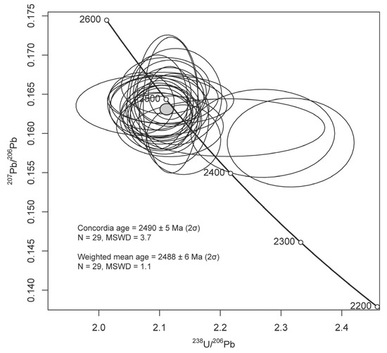 A total of 31 measuring points were conducted for 31 zircon grains from the Huangcha Pluton (Z119-1). The U-Th content ranges from 13 to 109 ppm to 20 to 282 ppm, while the Th/U ratios range from 0.22 to 0.98 (refer to Table 1), characteristics typical of magmatic zircons. With the exception of two zircon analysis points showing a slight lead loss, all other analytical results are plotted on or near the concordia curve. Excluding the two points, namely 1.1 and 30.1, which yielded slightly smaller dating results, the remaining 29 analytical points yielded a 207Pb/206Pb weighted mean dating result of 2488 ± 6 Ma (MSWD = 1.11) (Figure 5). This age represents the crystalline age of zircon and signifies the formation age of the Huangcha Pluton.