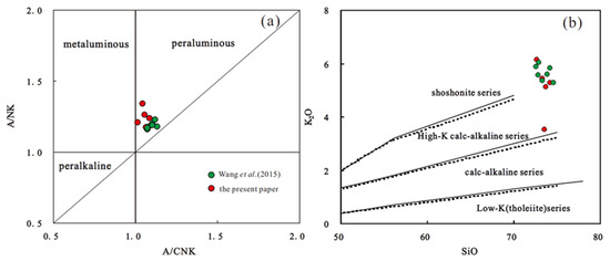 Geochemical diagrams of the Huangcha granite in the Zanhuang Complex. (a) A/NK-A/CNK and (b) SiO2-K2O [31].