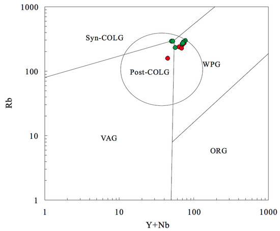 Rb versus (Y + Nb) tectonic discrimination diagram of the Huangcha granite in the Zanhuang Complex (Green circle data from [31], red circle data from the present paper, base diagram from [59]).