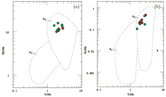 Rb/Nb versus Y/Nb (a) and Sc/Nb versus Y/Nb (b) tectonic discrimination diagrams of the Huangcha granite in the Zanhuang Complex (Green circle data from [31], red circle data from the present paper, base diagram from [74]).