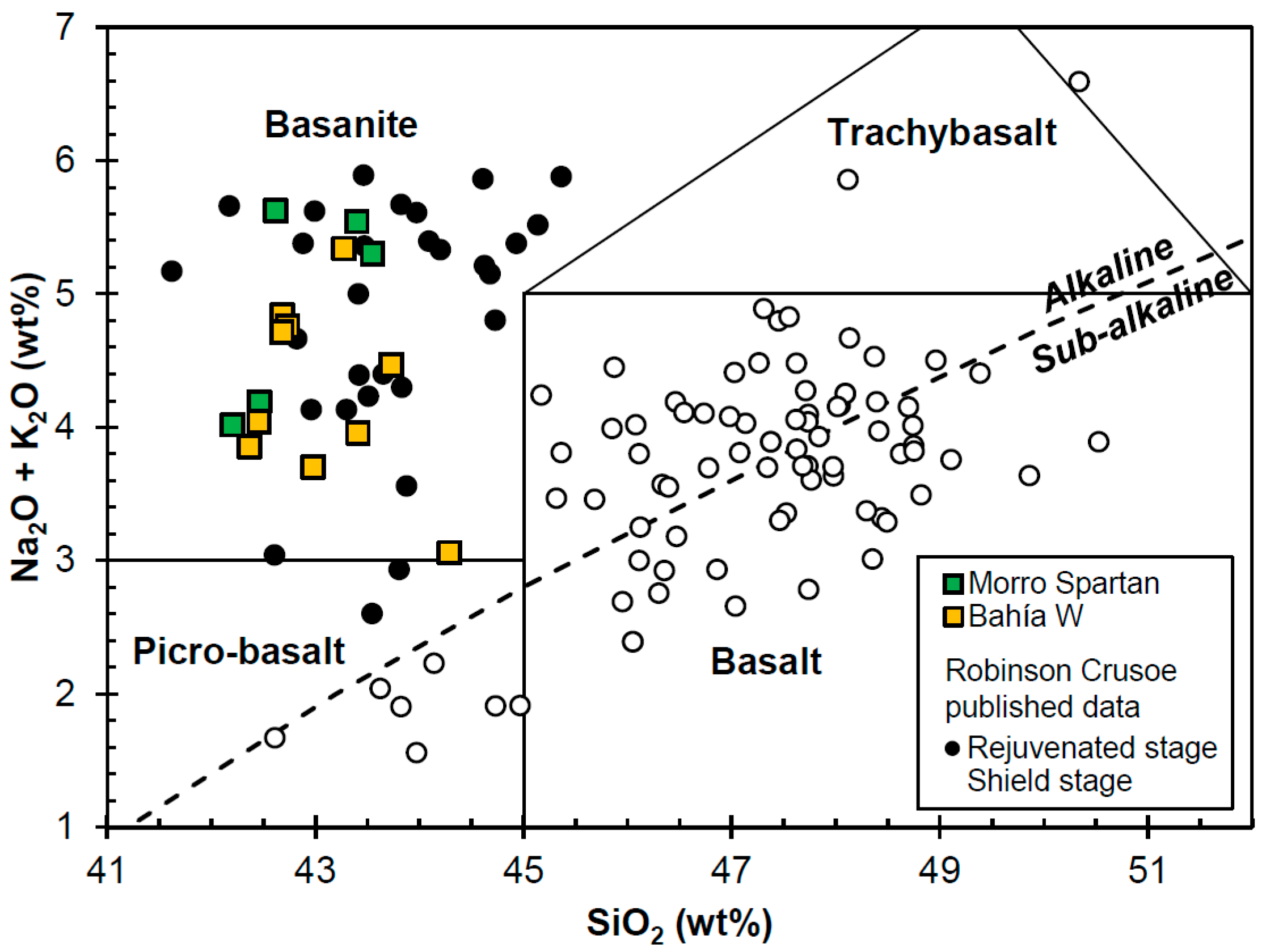 - Lara, L.E.; Reyes, J.; Sepúlveda, P.; Orozco, G.; Piña, M.; Becerril, L. Geología de las islas Robinson Crusoe y Santa Clara, región de Valparaíso. In Carta Geológica de Chile; 1 mapa escala 1:25,000; Serie Geología Básica; Servicio Nacional de Geología y Minería: Santiago, Chile, 2022; Volume 213, 42p. [Google Scholar]