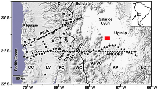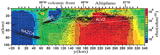 - Schilling, F.R.; Trumbull, R.B.; Brasse, H.; Haberland, C.; Asch, G.; Bruhn, D.; Mai, K.; Haak, V.; Giese, P.; Muoz, M.; et al. Chapter 22—Partial melting in the Central Andean crust: A review of geophysical, petrophysical, and petrologic evidence. In The Andes: Active Subduction Orogeny, Frontiers in Earth Sciences; Oncken, O., Chong, G., Franz, G., Giese, P., GÃutze, H.J., Ramos, V.A., Strecker, M.R., Wigger, P., Eds.; Springer: Berlin/Heidelberg, Germany, 2006; pp. 459–474. ISBN 978-3-540-48684-8. [Google Scholar]