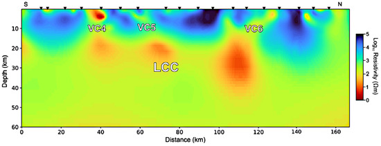 - Araya Vargas, J.; Meqbel, N.; Ritter, O.; Brasse, H.; Weckmann, U.; Yáñez, G.; Godoy, B. Fluid Distribution in the Central Andes Subduction Zone Imaged with Magnetotellurics. J. Geophys. Res. 2019, 124, 4017–4034. [Google Scholar] [CrossRef]