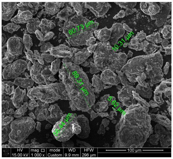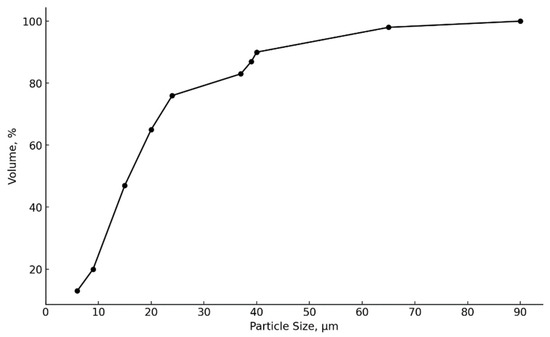 XRD analysis of the CFD showed the presence of anglesite (PbSO4), galena (PbS), zinc ferrite (ZnFe2O4), and cuprospinel (CuFe2O4) as lead, zinc, and copper-containing minerals in the crystalline part of the sample. Interestingly, no arsenic-containing minerals were detected in the diffraction pattern; this fact may indicate that arsenic is concentrated in the amorphous part of the sample. In general, the studied dust sample was characterized by a high degree of amorphy (more than 73% of the amorphous part). The analysis of the particle size distribution of CFD particles, as illustrated in Figure 3, demonstrates that 80% of the particles were finer than 38 µm (P80 value).