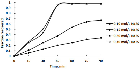 The effect of leaching duration and sodium sulfide concentration on arsenic recovery into solution is presented in Figure 6; other parameters were maintained at the following levels: 0.50 mol/L NaOH; liquid-to-solid ratio 50 mL/g; 80 °C; ultrasound frequency 100 kHz.
