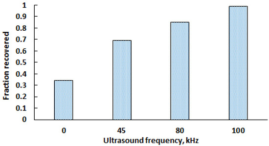 The next series of experiments was aimed at identifying the influence of ultrasound frequency and temperature on the extraction of arsenic into solution. Figure 8 shows the dependence of arsenic extraction into solution on ultrasound frequency.