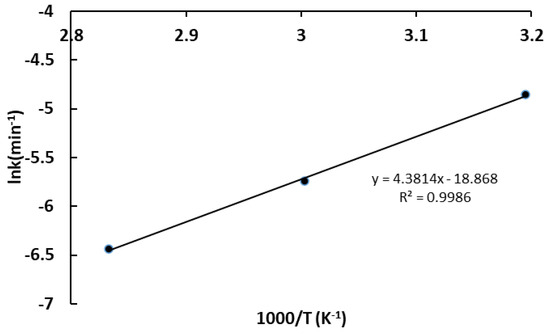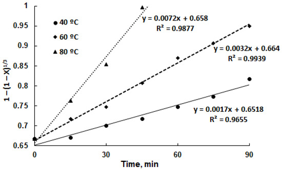 To determine the kinetic parameters of the arsenic leaching process, the data from Figure 9 were used in combination with Equation (5), and the resulting plots of 1 ( 1 X M e ) 1 3 vs. leaching duration at three different temperatures are presented in Figure 10.