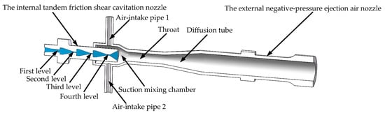Figure 1 illustrates the schematic configuration of the homemade double-nozzle jet micro-bubble generator. As depicted in Figure 1, the homemade double-nozzle jet micro-bubble generator consists of two parts: an internal tandem friction shear cavitation nozzle and an external negative-pressure-induced air nozzle. The internal tandem friction shear cavitation nozzle consists of four levels of nozzles: the first level for the cone-convergence-type nozzle, the second and third levels for the rectangular convergence of the flat friction nozzle, and the fourth level for the friction shear cavitation nozzle. The external negative-pressure ejection air nozzle consists of two air-intake pipes, a suction mixing chamber, throat, diffusion tube, and flow regulator tube. The physical diagram of the double-nozzle jet micro-bubble generator is shown in Figure 2.