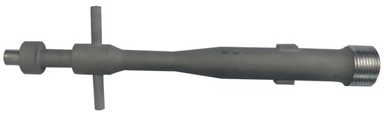 The external negative-pressure-induced air nozzle adopts a long throat design to enhance the likelihood of the colliding and adhesion of flake graphite particles and micro-bubbles and strengthen the mineralization effect. The throat’s diameter dh according to the empirical formula for jet pumps is as follows [,]: