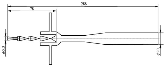The geometrical model of the inner fluid channel of the homemade double-nozzle jet micro-bubble generator is given in Figure 3. In Figure 3, for the internal tandem friction shear cavitation nozzles, the inlet diameter of the first-stage conical convergent nozzle is 5.3 mm, the flat section of the second third-stage rectangular convergent flat friction nozzles has a straight notch shape, and the diffusion section of the fourth-stage friction shear cavitation nozzle’s outlet diameter is 10 mm. The interior nozzles’ total length is 78 mm. For the external negative-pressure-induced air nozzle, the inlet diameter of both induced air tubes is 4 mm, and the suction mixing chamber’s diameter value is 20 mm. The double-nozzle jet micro-bubble’s total length value is 288 mm.