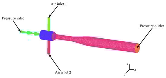 To determine the calculation method and boundary condition setting, a separation solver is applied to the air–water–flake graphite triple-phase flow field characteristics of the double-nozzle jet micro-bubble generator and the Eulerian multiphase flow model is selected. Moreover, the default first-order accuracy windward differential format is used, and the standardized k-ε model is selected for the turbulence model []. The convergence criterion for the numerical simulation is the residual R ≤ 10−6, the relaxation factors are all adopted as default values, and the pressure–velocity coupling approach employs the phase-coupled SIMPLE algorithm [].