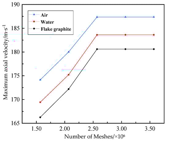 A high-quality mesh is critical to the impact of computational results. In practical fluid dynamics computational applications, it is necessary to find the threshold value to reach mesh irrelevance []. Mesh-independence verification is a common method to solve this problem, and the most reasonable meshing scheme is selected based on the computational accuracy of numerical simulations with different numbers of meshes []. This study examines the mesh independence of the maximal axis velocity of the air–water–flake graphite triple-phase flow field under the inlet pressure of 45 MPa for five different grid number conditions, and the results of the simulation calculations after reaching the steady state can be seen in Table 1.