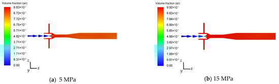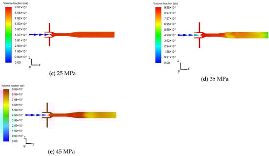 With different inlet pressures of the double-nozzle jet micro-bubble generator, the flake graphite slurry is ejected from the internal nozzles at different speeds, with varying air intake and air-phase volume fractions. Figure 6 depicts a cloud chart of the air volume fraction distribution when the inlet pressure of the micro-bubble generator is 5, 15, 25, 35, and 45 MPa, respectively. According to the data demonstrated in Figure 6, the air volume fraction in the flow field of the double-nozzle jet micro-bubble generator is more significant than 98% under different inlet pressures, and it is approximately uniformly distributed in the steady flow tube. Specifically, when the flake graphite slurry is ejected from the internal series friction shear cavitation nozzle at high speed, the cavitation nozzle’s exit point experiences negative pressure due to the high-speed flow of the slurry. The ejection generates a negative pressure, causing the outside air to be drawn into the mixing chamber via the entrance of the double-input pipe of the external air nozzle.