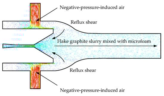 Figure 7 gives the vector diagram of air flow field velocity distribution in the mixing chamber of the external negative-pressure-induced air nozzle at the inlet pressure of 25 MPa of the double-nozzle jet micro-bubble generator. As seen in Figure 7, there is obvious air reflux near the wall of the diffusion section of the internal tandem friction shear cavitation nozzle; the refluxed air is superimposed with the air bubbles generated during the cavitation of the diffusion section and under the hostage effect of the slurry to form an air–water–flake graphite triple-phase flow to the downstream throat, diffusion tube up to the stabilizer tube, and the bubbles exhibit a uniform spread in the flow stabilizer tube. Therefore, the vacuoles generated by cavitation are an essential part of the gas volume percentage in the homemade double-nozzle jet micro-bubble generator. This is in agreement with Deng [], who found that the cavitation effect of the micro-bubble generator assumes a crucial function in micro-bubble production and the mineralization process during mineral flotation when simulated.