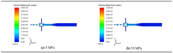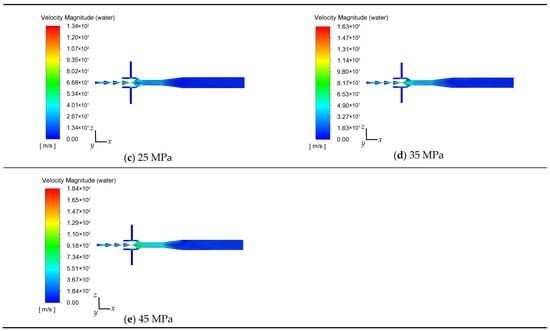 As shown in Figure 8, the axis velocity of the water of the double-nozzle jet micro-bubble generator shows a symmetrical distribution up and down at inlet pressures of 5, 15, 25, 35, and 45 MPa, respectively, and the maximum axis velocity of the water is proportional to the inlet pressure. Specifically, the liquid-phase water in the slurry enters the slurry through the inlet of the tandem friction shear cavitation nozzles inside the double-nozzle jet micro-bubble generator. After entering the water first through the internal nozzle of the first stage of the nozzle, the first stage of the nozzle convergence section of the axis velocity of the water increases rapidly. In the cylindrical section, the axis velocity basically remains unchanged; this is due to the cylindrical section of the entrance position. In the inertial effect of the water, the water can only exhibit a gradual, smooth, and continuous bending of the water flow so that the fluid cross-section of the contraction is of a certain degree. Then, into the second level of the rectangular convergence flat friction nozzle, because the second level of the nozzle entrance in the flow channel cross-section expands and then gradually contracts, the axis velocity of the water in the second level of the nozzle first decreases and then gradually increases in the friction section of the axial velocity, which remains unchanged. After entering the third level of the rectangular convergence flat friction nozzle, because the third level of the nozzle structure is the same as the second-level nozzle, the axis velocity of the water in the third level of the rule of change and the second level of the rule of change of is the same. Finally, the water enters the fourth level of friction shear cavitation nozzle because the fourth level of nozzle channel structure in the before diffusion section with the second level and the third level of nozzle structure, so in this part of the channel in the axis velocity change rule of the water with the second level, the third level of the axis velocity change rule of the nozzle is the same; in the nozzle diffusion section of the axis velocity of the water is rapidly decreasing.