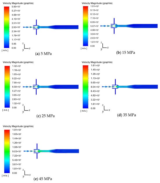 As shown in Figure 9, the change rule and distribution of axis velocity of the flake graphite of the double-nozzle jet micro-bubble generator is the same as that of the water when the inlet pressures are 5, 15, 25, 35, and 45 MPa, respectively. The maximum axis velocity of the flake graphite is proportional to the inlet pressure. The maximum axis velocities of the flake graphite are 58.5, 101.0, 132.0, 161.0, and 181.0 m/s when the inlet pressures are 5, 15, 25, 35, and 45 MPa, respectively.