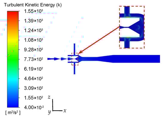 After studying the law of the inlet pressure on the triple-phase velocity flow field, the influence of the inlet pressure on the turbulence intensity of the law was further studied. Figure 10 provides an example of the turbulence kinetic energy distribution of the double-nozzle jet micro-bubble generator inlet pressure of 15 MPa in a cloud diagram. As can be seen from Figure 10, the turbulent kinetic energy reaches its maximum at the joint of the double air-intake pipe and the mixing chamber, and the maximum value is generated due to the low-speed airflow being sucked, collided, and sheared by the high-speed jet slurry. The high turbulence intensity is conducive to promoting the air–water–flake graphite mixing, thus improving the shear effect on the airflow introduced by the negative pressure, which is conducive to the realization of the generation and uniform distribution of micro-bubbles.