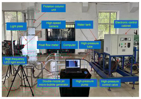 The bubble visualization test system for the homemade double-nozzle jet micro-bubble generator is shown in Figure 11. As seen in Figure 11, the system mainly consists of a water tank, a high-pressure pump, a high-pressure control valve, a high-pressure tube, a double-nozzle jet micro-bubble generator, a float flow meter, a flotation column unit, a high-frequency LED light source, a light plate, a high-speed camera, and a computer PC port. During the test, the inlet pressure of the double-nozzle jet micro-bubble generator was 15 MPa, and the air inlet of the float flow meter was 20 LPM. The high-speed camera captured a photo of the bubble group morphology generated by the air–water two-phase fluid injected into the capture area of the flotation column unit through the double-nozzle jet micro-bubble generator.