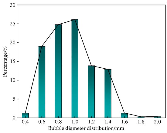 Since the bubble size determines the surface area of the bubble in contact with the flake graphite particles, it plays a crucial role in the flotation flake graphite environment. Therefore, to evaluate the bubble size generated by the double-nozzle jet micro-bubble generator, Image-Pro Plus software was used to obtain the average bubble size, and the bubble size distribution graph was plotted, to visually characterize the diameter of micro-bubbles generated by the double-nozzle jet micro-bubble generator. The histogram of bubble diameter distribution is shown in Figure 13, from which it can be seen that the bubble size distribution is unimodal, and the average size of bubbles less than or equal to 1 mm accounted for 71.26% of the total number of bubbles, indicating that the bubble size distribution is centralized, presenting a uniform bubble group dispersion distribution state and a good specific surface area, which is conducive to the realization of the sorting of the flake graphite.