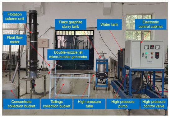 The integrated test system of the double-nozzle jet micro-bubble generator on flake graphite grinding and floating is shown in Figure 14. As can be seen in Figure 14, the system mainly consists of a water tank, high-pressure pump, electronic control cabinet, high-pressure pipe, high-pressure control valve, flake graphite slurry tank, double-nozzle jet micro-bubble generator, a float flow meter, flotation column unit, concentrate collection bucket, and tailings collection bucket and other components. The test process is as follows: a high-pressure pump to pressurize the water to the working pressure of 15 MPa, pressurized high-pressure water into the flake graphite slurry tank to complete the mixing with the flake graphite after the flow to the double-nozzle jet micro-bubble generator, the internal tandem friction shear cavitation nozzle for multistage dissociation of the flake graphite to achieve the function of grinding, while at the same time, a graphite slurry high-speed flow of the negative pressure generated by the air sucked into the external negative-pressure ejection air nozzle inside the mixing chamber, air from the high-speed flow of the graphite slurry impact and shear action to form tiny bubbles, and gas–liquid two-phase accumulation to form a high gas capacity, conducive to the formation of mineralization bubbling and mineralization function. The flake graphite slurry after grinding and mineralization is discharged to the flotation column device through the double-nozzle jet micro-bubble generator, the graphite concentrate and tailings are separated in the flotation column device, the graphite concentrate is collected in the concentrate tank at the upper end of the flotation column device, and the tailings are discharged from the tailings tank at the lower end of the flotation column device, which realizes the integration of grinding and flotation in the processing of flake graphite.