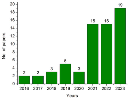 The recently released handheld spectrophotometer by Bruker Optics, commercially named Bravo, employs two different excitation lasers (852 and 785 nm) to cover a spectral range initially comprised between 300 and 3200 cm−1 [28]. After 2020, the instrument spectral range was extended to cover a wider range comprised between 170 and 3200 cm−1, which was a significant improvement, particularly for the investigation of inorganic compounds. The sequentially shifted excitation technology (SSETM) and the PCA-based algorithm are exploited to provide the processed background-free and smoothed spectra. This processing procedure is particularly helpful in solving the common background collection produced by the short optical paths typical of portable instrumentation [29], as well as from the strong luminescence produced by cultural heritage organic materials. The application of Bravo Raman has increased considerably in the heritage science field as is evidenced by the recently published scientific literature (Figure 1). The trend of the employment of the instrumentation is exponential, with a decrease in 2020 corresponding to the COVID-19 pandemic. Bravo spectrophotometer proved powerful in addressing research problems pertinent to the identification of historical and modern pigments and lakes [30,31,32,33,34,35,36,37,38,39,40,41,42,43,44,45,46,47,48,49,50,51,52,53], minerals and gems [22,29,54], manuscripts [55,56], mosaics [2,57], and metal and metal corrosion products [58,59,60]. The present work aims to create a database using the 852 nm laser excitation wavelength for the most commonly employed art pigments, which can be regarded as the precursor of a larger open-source database of artistic colorants that is expected to be available online in the upcoming years. The goals of this study are to verify the possible differences in the Raman spectra acquired at 852 nm as compared to 785 nm when analyzing a set of different historical pigments frequently encountered during the analysis of polychrome surfaces, and based on the spectral characteristics of the materials, generate a summary to support researchers and conservators in the interpretation of the Raman spectra.