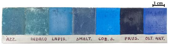 Restorers at Opificio delle Pietre Dure (Florence, Italy) realized the mock-up panel painting in 1995. It was prepared to employ wooden support with a ground layer of rabbit glue and gypsum (CaSO4·2H2O) (ratio 1:16 v/v) until saturation of the glue, applied with a brush in two steps (the second layer was applied once the first one was completely dry). On top of the ground layer, the imprimitura made of rabbit glue and H2O in a ratio of 1:32 was applied. Once completed, the prepared surface was divided into sections by drawing slots (1 cm × 3 cm). Egg tempera was prepared by mixing two parts of yolk, one of egg white and one of vinegar. The mock-up panel painting (Figure 2) includes blue pigments such as azurite, indigo, Lapis lazuli, smalt, cobalt blue, Prussian blue, and artificial ultramarine and was investigated using conditions specified in Table 3.