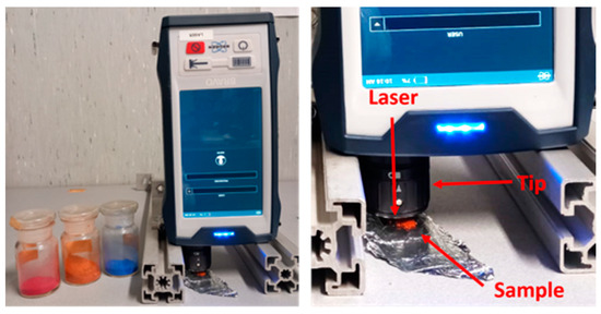 The pigment powders were placed on a sheet of aluminum foil, and the Bravo instrument was placed in a vertical position over two aluminum square supports (Figure 3). In this configuration, the laser beam impinges vertically on the pigment powders without any interference.