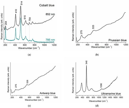 Antwerp blue (Figure 4c) is a combination of Prussian blue and Cobalt blue [66]. The Raman spectra obtained with 852 nm laser excitation wavelength highlight only the presence of Prussian blue for the two low-frequency bands located at 275 and 533 cm−1, and no information about the presence of cobalt blue was detected [65].
