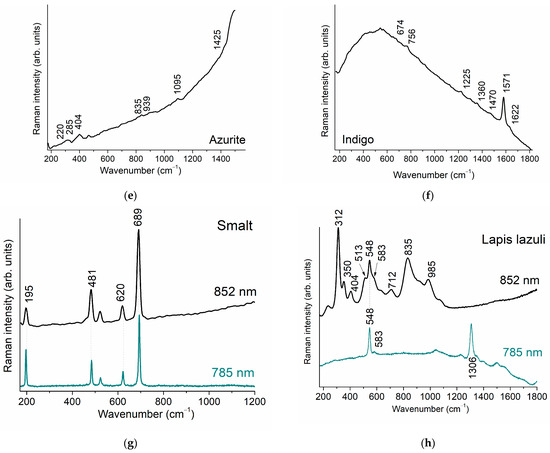 The 852 nm Raman spectra of eight blue pigments—cobalt blue, Prussian blue, Antwerp blue, ultramarine, azurite, indigo, smalt, and Lapis lazuli—are displayed respectively in Figure 4a–h. For Cobalt blue, smalt, and Lapis lazuli, some differences between 852 and 785 nm-generated Raman spectra were detected; therefore, comparative spectra are reported in Figure 4a,e,f.