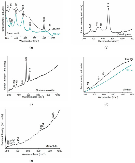 Five green pigments—green earth, cobalt green, chromium oxide, malachite, and viridian—were analyzed. The 852 nm laser excitation spectra are reported in Figure 5a–e. Spectra with 785 nm are reported for green earth (Figure 5a) and viridian (Figure 5d).