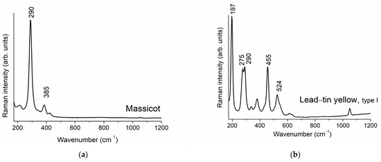 Lead–tin yellow type I (Pb2SnO4) spectrum (Figure 6b) at 852 nm is well characterized by the bands at 197, 275, 290, 455, and 524 cm−1. The main band of lead–tin yellow at 130 cm−1 (due to symmetric stretching vibration of Pb-O) [82] is out of the detectable spectral range of the instrument. No significant differences as compared to 785 nm were observed.