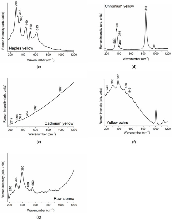 The 852 nm Raman spectra of six yellow pigments investigated—massicot, lead–tin yellow type I, Naples yellow, chromium oxide, cadmium yellow, yellow ochre, and raw sienna—are reported in Figure 6a–g. No significant spectral changes are recorded compared with the 785 nm laser excitation wavelength.