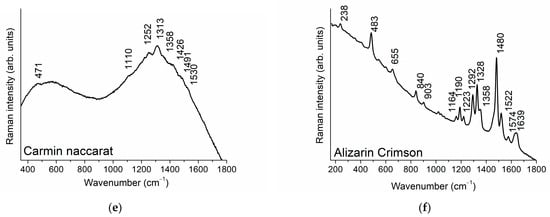 Raman spectrum of Alizarin crimson (Figure 7f) is characterized by bands placed at 1480, 1328, and 1292 cm−1 and other characteristic bands at 238, 483, 655, 840, 903, 1020, 1047, 1164, 1190, 1223, 1358, 1522, 1574, and 1639 cm−1.