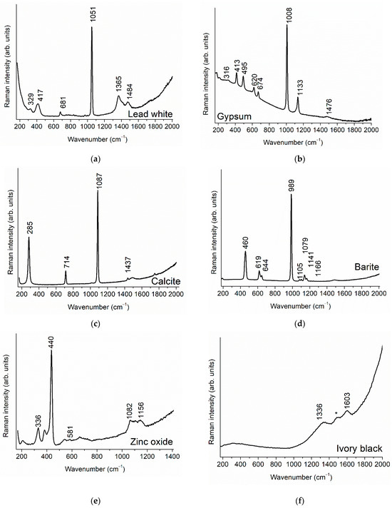 The spectra of the five white pigments investigated—lead white, gypsum, calcite, barite, and zinc oxide—are reported in Figure 7a–d together with that of ivory black (Figure 7f). Lead white (PbCO3)2·Pb(OH)2) (Figure 8a) is detected by the Raman band at 1051 cm−1 (symmetric stretching of CO32− ion) [89] and by the bands at 1365 and 1484 cm−1 due to asymmetric stretching mode of CO32− [68]. Other lower-intensity bands are placed at 329, 417, and 681 cm−1.