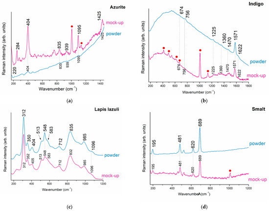 Raman spectra of blue pigments in mock-up panel painting: (a) azurite, (b) indigo, (c) lapis lazuli, and (d) smalt. Pink lines (named mock-up) indicate the Raman spectra acquired on mock-up panel painting, and cyan lines (named powder) refer to Raman spectra of pigments in powder. All the spectra are acquired with an 852 nm laser excitation wavelength.