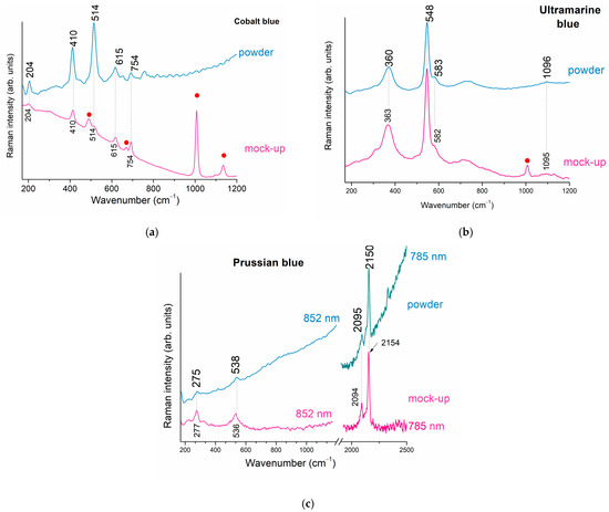 Raman spectra of blue pigments in mock-up panel painting: (a) cobalt blue, (b) ultramarine blue, and (c) Prussian blue (spectral range 170–2500 cm−1). Pink lines (named mock-up) indicate the Raman spectra acquired on mock-up panel painting, and cyan lines (named powder) refer to the Raman spectra of pigments in powder. All the spectra are acquired with an 832 nm laser excitation wavelength, and Prussian blue is also acquired with a 785 nm laser excitation wavelength.