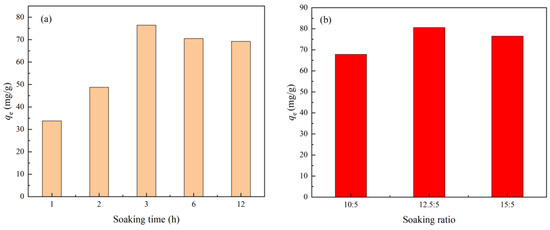 Firstly, the influence of COS immersion time in H3PO4 on the adsorption of La3+ was studied by fixing the activation time at 60 min, and the experimental conditions were set with an impregnation ratio of H3PO4 to COS of 15 mL/5 g, an activation temperature of 500 °C, an Na2EDTA dosage of 10 mmol, a solution pH of 5.5, and an initial La3+ concentration of 100 mg/L. The results of the adsorption performance are given in Figure 2a. When the soaking time increased from 1 to 12 h, the adsorption efficiency of the activated carbon for La3+ initially rose and then declined. With an extension of the immersion time from 1 to 3 h, the La3+ adsorption capacity of the activated carbon experienced a rapid increase, reaching 76.5 mg/g. When the time further increased to 12 h, the La3+ adsorption capacity of the activated carbon slowly declined. The cause for this may be attributed to the hydrolysis of lignin in COS by phosphoric acid, leading to an enhancement in the pore size of the activated carbon as the immersion time is prolonged. However, further extension of the time may lead to excessive erosion of the carbon skeleton, thus reducing the performance of the activated carbon. Therefore, the best soaking time of 3 h was used to study the influence of the soaking ratio 10/5, 12.5/5, and 15/5 during the adsorption test. The resulting adsorption capacities of COSAC for La3+ were observed to be 67.85, 80.58, and 76.5 mg/g, respectively, as shown in Figure 2b. Consequently, the optimal impregnation ratio was determined to be 12.5/5. This specific impregnation ratio was subsequently employed in the subsequent experiments.