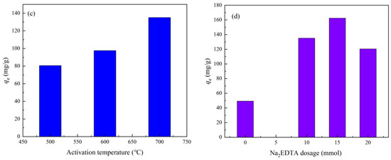 La3+ adsorption performance of COSAC following different preparation conditions. (a) qe vs. soaking time; (b) qe vs. soaking ratio; (c) qe vs. activation temperature; (d) qe vs. Na2EDTA dosage.