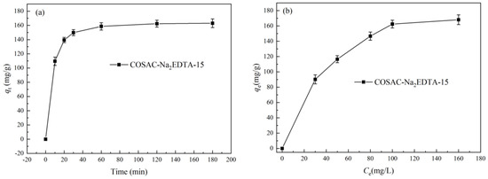The best Na2EDTA-modified activated carbon from COS (COSAC-Na2EDTA-15) was prepared with a soaking time of 3 h, a soaking ratio of 12.5/5, an activation temperature of 700 °C, and an Na2EDTA dosage of 15 mmol. Figure 3 illustrates the adsorption performance of COSAC-Na2EDTA-15 at different contact times and initial La3+ concentrations. The adsorption capacity of lanthanum ions exhibits a rapid increase over time, reaching 90% of the maximum adsorption capacity within thirty minutes, as shown in Figure 3a. With a continued increase in time, the adsorption progressively decelerated and eventually reached equilibrium after 2 h. At this time, the adsorption capacity was 162.43 mg/g.