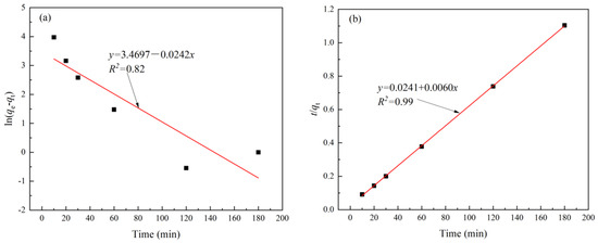 In order to examine the adsorption mechanism of COSAC-Na2EDTA-15 for La3+, the P-F-O KM and P-S-O KM were applied for nonlinear regression fitting of the adsorption data. The corresponding kinetic fitting curves are given in Figure 4a and Figure 4b, respectively. In comparison to the P-F-O KM, the P-S-O KM exhibited a stronger correlation with the adsorption data of La3+ on COSAC-Na2EDTA-15, and its correlation coefficient was 0.99. This result suggests that the process of the adsorption of La3+ onto COSAC-Na2EDTA-15 mainly involved chemical adsorption [38].