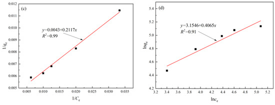 Kinetics and isotherm fitting curves. (a) ln(qe − qt) vs. time; (b) t/qt vs. time; (c) 1/qe vs. 1/Ce; (d) lnqe vs. lnCe.